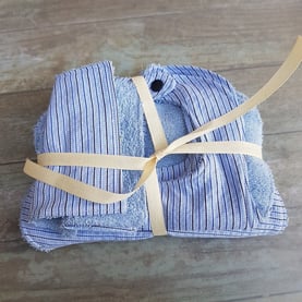 Ensemble de 2 bavoirs 1er âge, 1 baby-burp et 2 lingettes en coton rayé bleu ciel et marine. Le tout doublé de tissu éponge bleu ciel.
