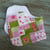 Protège-épaule en tissu coton imprimé patchwork rose et vert doublé d'éponge blanche très douce en coton et bambou.
