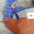 Porte doudou patchwork de tissus bleus et marron doublé de coton madras à carreaux bleus . Voir ici le descriptif