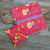 Trousse de toilette en coton enduit rouge imprimé fleuri avec pochette à savon assortie.