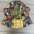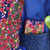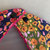 Bavoir papillon en coton bleu marine et vert imprimé de fleurs rouges, rose oranges.