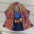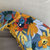 Bavoir papillon imprimé de fleurs oranges jaunes et rouges sur fond bleu.