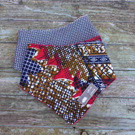 Bandana en wax bleu marron et rouge doublé de tissu éponge rouge foncé