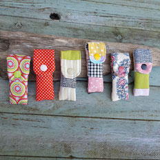 Pince à épiler dans sa pochette molletonnée rose, vert, bleu, quadrillage noir sur blanc.