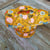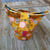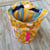 Pochette isotherme en tissu enduit jaune imprimé de fruits et de fleurs.